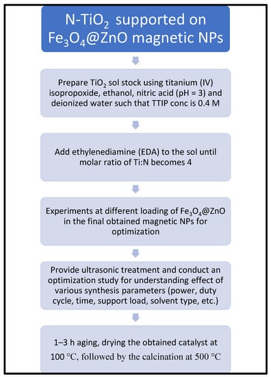 Stepwise methodology for the synthesis of N-doped TiO2 supported on magnetic NPs using the ultrasound-assisted method.