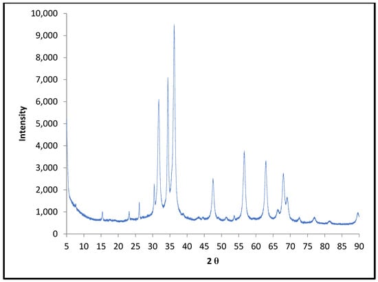 Figure 6 shows the XRD pattern of the synthesized magnetic Fe3O4@ZnO NPs. The distinct diffraction peaks of Fe3O4 were detected at the angles of 2θ = 30.48°, 43.2°, and 53.6°. A few peaks of Fe3O4 coincided with those of ZnO, resulting in amplified peaks. The distinct peaks of ZnO were observed at the angles 2θ = 31.76°, 34.43°, 36.26°, 47.5°, 56.65°, 62.91°, 66.4°, 67.96°, and 69.19°. These results are consistent with those reported by Beltran-Huarac et al. [37]. The presence of peaks corresponding to both Fe3O4 and ZnO confirms the existence of both of these compounds in the core–shell configuration. The Debye–Scherrer equation was applied for the estimation of crystallite size as follows: