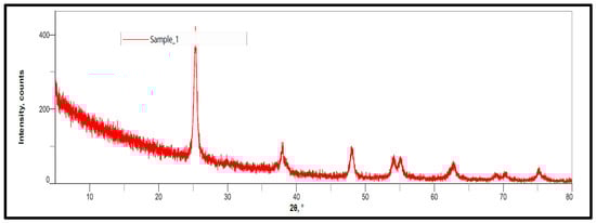 Figure 7 shows the XRD pattern of the N-TiO2/Fe3O4@ZnO catalyst obtained using the US-assisted approach. The prominent peaks were obtained at 2θ = 25.3°, 37.8°, 47.9°, 54.1°, 55.1°, 62.9°, 68.9°, and 75.1°, showing the presence of TiO2 in the anatase phase and predominantly crystalline [38]. The coinciding peaks at 47.5° and 62.9° elucidated the presence of the Fe3O4@ZnO support in the catalyst complex. The XRD pattern also indicated that N doping in TiO2 did not alter its crystalline nature. The average crystallite size for the N-TiO2/Fe3O4@ZnO nanoparticles, estimated using the Debye–Scherrer equation, was 16.69 nm.
