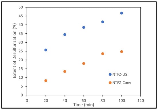 Experiments were performed using the catalysts obtained using both ultrasonic and conventional approaches at 2 g/L of catalyst loading and 3 mL/L of H2O2 loading to compare their activity in the desulfurization of diesel oil. The results shown in Figure 9 confirm that desulfurization obtained using the sonochemically synthesized catalyst was 47% in 100 min, while only 25% desulfurization in same 100 min was obtained for the conventional catalyst. This result can be explained on the basis that sonochemically synthesized catalysts have a lower particle size and higher surface area, offering better catalytic action for desulfurization of thiophene, as also established in the literature, albeit for different catalysts. Tiple et al. [28] reported 29% extent of desulfurization of thiophene using conventionally synthesized TiO2, while US-assisted TiO2 showed 43% desulfurization. Amiri et al. [42] reported excellent photocatalytic activity of magnetically driven Ag/Fe3O4/graphene nanocomposites, with 95% desulfurization activity in 2 h and effective reuse of the catalysts for 10 cycles. Similarly, 91% desulfurization of dibenzothiophene and 64% desulfurization of benzothiophene were observed by Dedual et al. [5] using TiO2 as a catalyst under the optimal operating conditions of 40 °C as the temperature, pH of 4, 6 g/L as the TiO2 dose, and 0.7% v/v as the H2O2 loading.