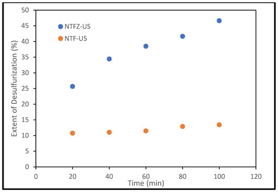 A comparative study was performed between the catalysts containing ZnO (NTFZ-US) in the support matrix along with Fe3O4 and the one without ZnO (NTF-US), at a constant catalyst loading of 2 g/L and 3 mL/L as the H2O2 dosage. The results illustrated in Figure 10 establish that desulfurization as high as 47% in 100 min was obtained for NTFZ-US, whereas much lower desulfurization (as low as 14%) was obtained in the same treatment time for the NTF-US catalyst. The obtained results prove that the presence of ZnO, along with the TiO2 photocatalyst, provides a synergistic effect and enhances the photocatalytic activity of the complex attributed to the interactions of the two oxides, lowering the bandgap energy and driving enhanced generation of the oxidizing species. This trend is similar to that reported by Khaki et al. [43], where remarkably improved characteristics were demonstrated for the Cu-TiO2/ZnO catalyst compared to individual TiO2 and ZnO. The major governing mechanism was the reduction in the bandgap level of Cu-TiO2/ZnO (2.2 eV) compared to TiO2 and ZnO (3.2 eV and 3.37 eV, respectively), which resulted in higher photodegradation of methylene blue. Another study by Fatimah and Novitasari [44] also explained the complimentary behavior of TiO2 and ZnO during the degradation of phenol using sonophotocatalysis; 99.99% degradation was observed when the TiO2-ZnO complex was used, while 90.99% and 80.99% degradation was obtained for TiO2 and ZnO, respectively.