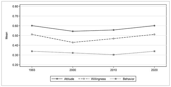 Environmental attitude, willingness, and behavior over time. Notes: Mean of attitude, willingness, and behavior indices in 1993, 2000, 2010, and 2020.