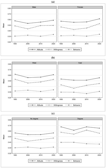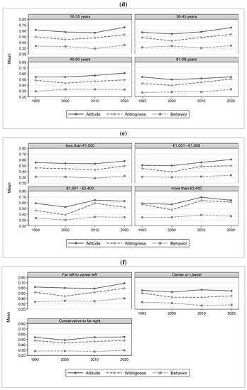 Against this background and in the context of the attitude–behavior gap, which has been shown to be empirically relevant (e.g., [23,24,25]), it is insightful to separately examine how environmental attitude, willingness, and behavior have evolved in Germany over time, sincePeoples’ willingness to act in a certain way can be seen as a bridge between their attitude and behavior, as they can be seen as a behavioral intention [26]. By doing this, we can attain a better understanding of which transformation might be possible and under which conditions (e.g., [1,2,3,4,5]). In addition to examining how environmental attitude, willingness, and behavior have evolved over time, it is also important to know how they differ between different social groups and how these differences have evolved over time. Policy makers can then specifically target measures at different social groups, and incorporate possible changes in the environmental attitude, willingness, and behavior of these groups.