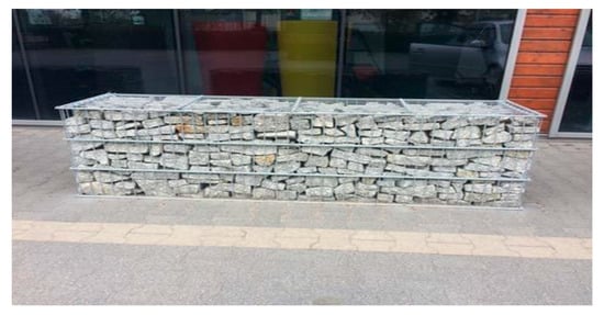 Natural stone shows similar properties to concrete. Furniture made of it is successfully used for public spaces. Architecture based on this material fits well into urban space and the rural landscape. The high resistance of some stones to changing climatic conditions allows it to serve users of urban furniture for many years. The combination of stone and steel in the form of gabions (Figure 2) is being used more and more boldly, as elements of fences, retaining walls, or modern seats and pots [21].