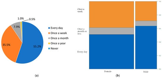 (a) Results of answers to the question: “How often do you use city furniture?” (Own source). (b) The spineplot shows the percentage of the answers given in relation to the category (gender); the widths of the bars reflect the proportion of the size of the groups.