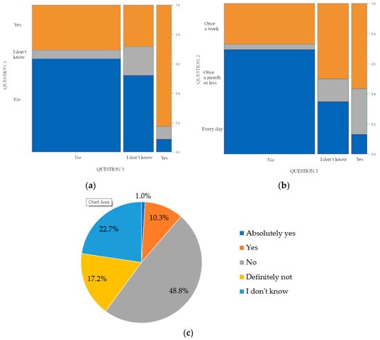 (a) The spineplot shows results of answers to question 3 in relation to the answers to question 1; (b) The spineplot shows results of answers to question 3 in relation to the answers to question 2; (c) The results of responses to question 3 “Do you think the number of urban furniture in the city of Poznań is sufficient?” (Own source).