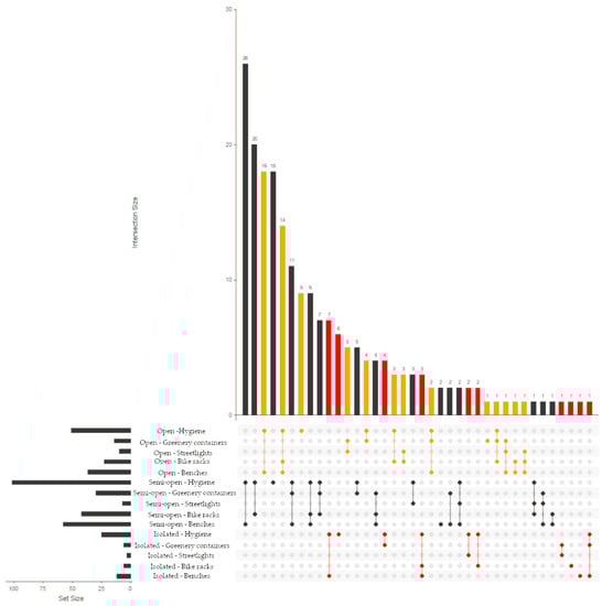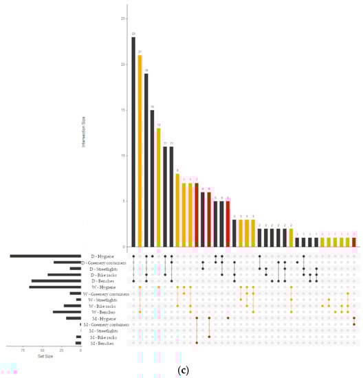 (a) Venn diagram of distribution of the answer to the question: “What urban furniture do you think is missing in the public space of the city of Poznań?” (Own source). “Hygiene” includes responses regarding: “public toilets”, “dog excrement containers”, and “waste bins”; (b) UpSetR graph shows the structure of respondents’ answers regarding the lack of urban furniture by group according to the answer to question 1: Do you think that the number of separated public spaces in the city of Poznań is sufficient? (c) UpSetR graph shows the structure of respondents’ answers regarding missing urban furniture by declared frequency of use of urban furniture (D—daily, W—once a week, M—once a month or less often).