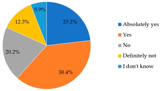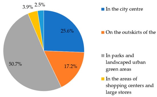 In addition, when asked where they thought there was a need for more urban furniture, the majority of respondents chose parks and areas landscaped with urban greenery—50.7%, indicating the need to plan more urban furniture in these areas in particular and expressing the need for young people to have contact with nature. They considered their incidence in the areas of shopping centres and near large stores to be the least deficient. The results of the responses in graphical form are shown in Figure 8.