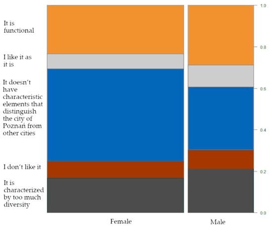 When asked for their opinion on existing furniture, students believe that it lacks distinctive elements that distinguish Poznań from other cities—this is pointed out by 45% of female and 30% of male respondents, and is characterised by too much variety (18%: 17% for women and 21% for men, respectively). Some students say that the existing city furniture is functional (25%), with 29% of male and 23% of female respondents holding this opinion. The furniture is liked by 8% of respondents.