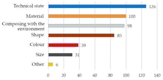 The next questions on the form referred to respondents’ expectations of urban furniture. The participants of the survey believe that the popularity of urban furniture in the space is determined primarily by its appropriate placement and fit to the needs of the user (Figure 9). Such answers were given by, respectively: 81 and 68 people. According to the respondents, the aesthetics of urban furniture are also important—42 people. The responses showed how important it is to plan urban furniture thoughtfully and to locate it on routes and in places that are most frequently used. Their functionality and the aforementioned ergonomic design are also important.