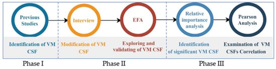 The aim of this study is to recognise the critical VM CSFs in Egyptian construction. Thus, the research methodology summarised the procedures adopted to achieve this aim []. This was accomplished through reading relevant material and conducting a semi-structured interview. A pilot study through exploratory factor analysis (EFA) was performed to check the results obtained from the interview []. Therefore, the questionnaire survey was conducted to ask professionals with sufficient VM studies experience to express their opinion on each of the nominated factors. The Pearson correlation analysis was employed to calculate the correlation among the factors and validate the results from EFA. Moreover, the relative importance index (RII) analysis was conducted to examine the different factors and groups that are vital to implementing VM effectively in the Egyptian building industry. The research design, which is adapted from [,] is illustrated in Figure 1.