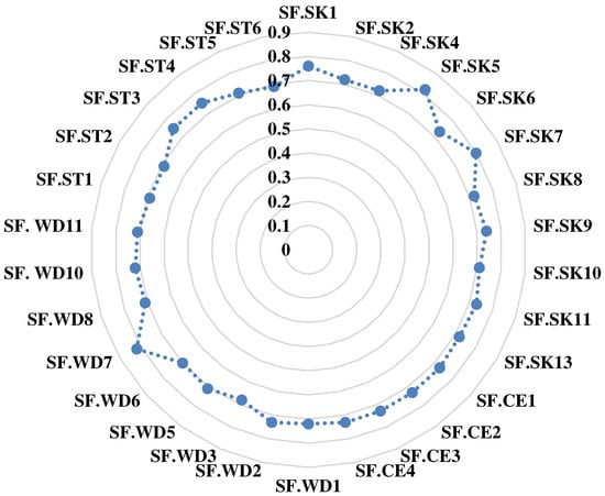 A pilot study in the Egyptian residential construction industry was undertaken to explore the results mentioned above through EFA, which sent the pilot questionnaire to an appropriate number of participants (200 construction professionals) [,]. The research instrument’s reliability was tested using the Cronbach alpha test. This test enables assessing the reliability of the in-area questionnaire and all the fields considered. The alpha values obtained ranged from 0.84 to 0.91, indicating a high-reliability level for the study’s surveys [,].