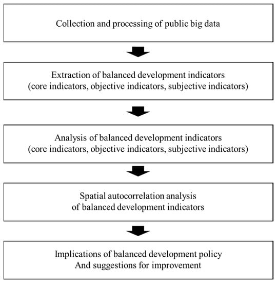 Therefore, in this study, balanced development indicators based on public big data were extracted and quantitative evaluation was performed on the balanced national development policies promoted by the Korean government. Based on this quantitative analysis, the purpose of this study was to numerically evaluate the policies promoted by the Korean government and to suggest improvement plans (Figure 1).
