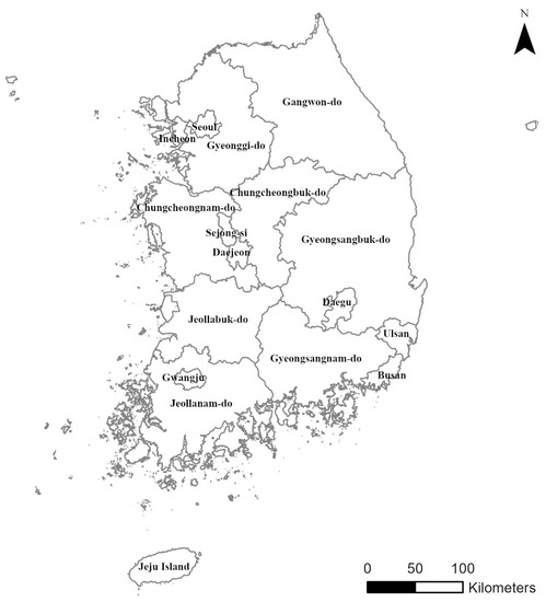 In all, 1000 were allocated to Seoul, and other metropolitan cities were differentiated by population. A total of 160 cities, with a population of 500,000 or more were allocated, and 140 cities with a population of 200,000 to 500,000 were allocated. In addition, 120 cities with a population of less than 200,000 and 100 counties were allocated. Additionally, the spatial scope for the analysis of balanced development indicators was targeted for 17 administrative districts in Korea. Korea’s Nationwide (NW) administrative district consists of one special city, six metropolitan cities, eight provinces, one special self-governing province, and one special autonomous city. A total of 17 administrative districts are classified as regional governments as follows: Seoul (SU), Busan (BS), Daegu (DG), Incheon (IC), Gwangju (GJ), Daejeon (DJ), Ulsan (US), Sejong-si (SJ), Gyeonggi-do (GG), Gangwon-do (GW), Chungcheongbuk-do (CB), Chungcheongnam-do (CN), Jeollabuk-do (JB), Jeollanam-do (JN), Gyeongsangbuk-do (GB), Gyeongsangnam-do (GN), Jeju Island (JJ) (Figure 2).