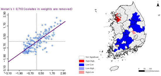 Moran’s I values representing the global cluster status of the annual average population growth rate indicator and the 3-year fiscal independence indicator were 0.710 and 0.693, respectively. Therefore, the population growth rate indicator showed a stronger overall spatial clustering than the fiscal independence indicator. In other words, it can be seen that the increase and decrease of the population is strongly centered on a specific region, indicating that the government policy for balanced development is not evenly distributing the population throughout the country. As a result of local autocorrelation analysis through LISA analysis, clusters of regions with high population growth (HH) occurred in some areas of Gyeonggi-do, Incheon, and Seoul, showing strong population concentration in the metropolitan area. On the other hand, cluster areas (LL) where population decline occurs are occurring in some areas, such as Gangwon-do, Chungcheongbuk-do, Gyeongsangbuk-do, Jeollabuk-do, Jeollanam-do, and Gyeongsangnam-do. Therefore, the concentration of the population in the metropolitan area and the decrease in the population in the provincial area were clearly shown. In the financial independence indicator for 3 years, high areas (HH) existed in the metropolitan area and low areas (LL) existed in the provincial areas, just like the population growth rate indicator. Financial independence was also experiencing difficulties in local areas.