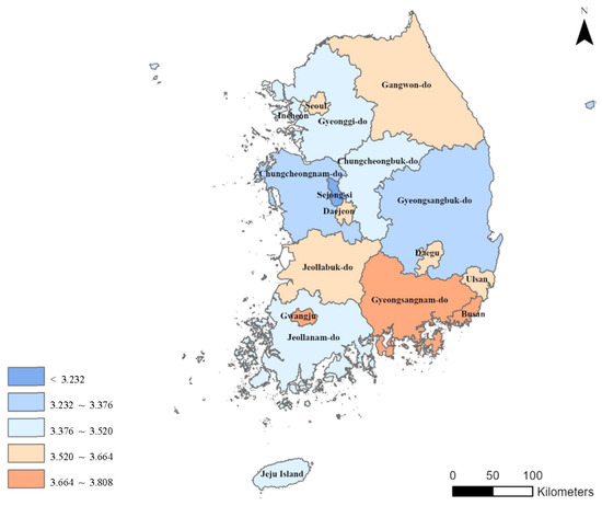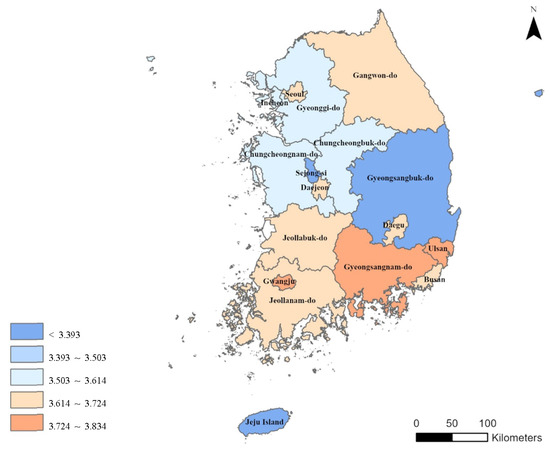Educational indicators consist of the number of childcare facilities per 1000 infants (0–5 years old), the number of schools per 1000 school-age population, the ratio of the infants and toddlers within daycare service area, and percentage of school-age population within the service area of elementary schools. Among them, the national average of the number of childcare facilities per 1000 infants, the ratio of the infants and toddlers within daycare service area, percentage of school-age population within the service area of elementary schools was 16.4 opens/1000 people, 70.5%, and 43.6%, respectively, showing a relatively similar value in all regions. However, the number of schools per 1000 school-age population was 1.4 opens/1000 people in Seoul and 4.2 opens/1000 people in Jeollanam-do, with large regional variations (Table 8).