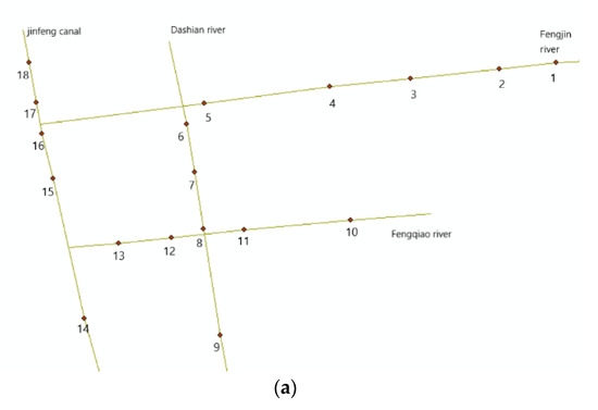 The river network is located at 120.51–120.53 east longitude and 31.30–31.31 north latitude. Four main river segments, including Fengjin river, Dashian river, Fengqiao river, and Jinfeng canal, were sampled with 5, 4, 4, and 5 sites, respectively, as shown in Figure 2. There is no routine monitoring for these river segments.