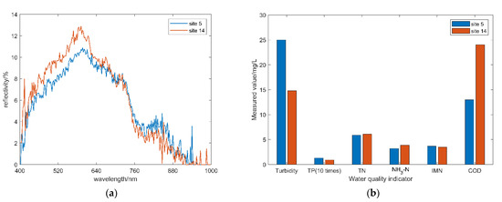Data at site 5 and site 14: (a) Spectral reflection curve; (b) Water quality indicator data.