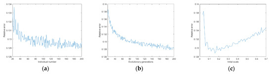 Effect of parameter on relative errors of training results: (a) individual number; (b) evolutionary generations, (c) initial scale.