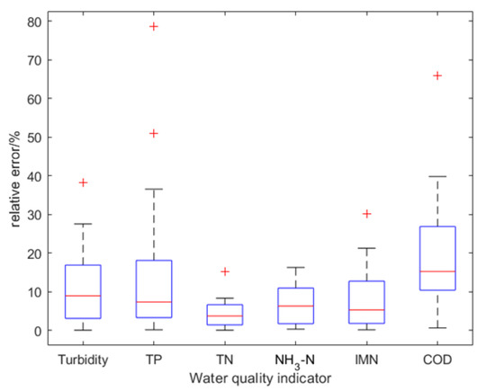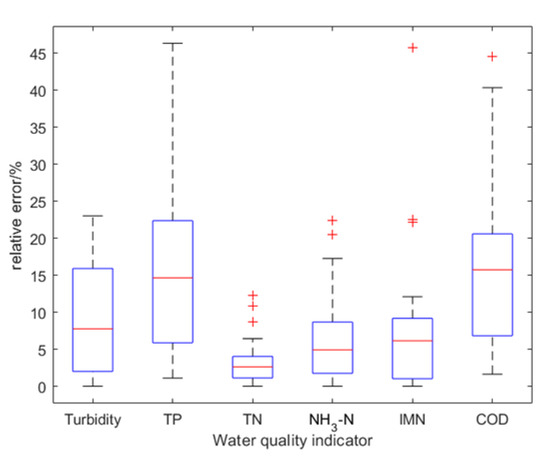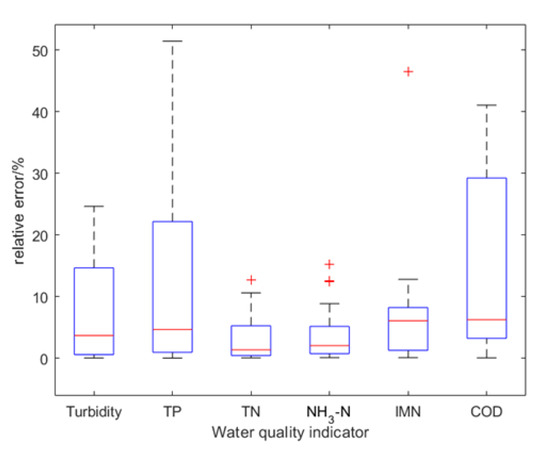 For each water quality indicator, the boxplot of relative errors at 14 sites is shown in Figure 9. When the relative errors of all six three-band models further decrease, compared with corresponding single-band and two-band models, the performance of the COD and TP model is still the worst.