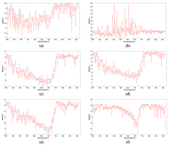 To understand the uncertainty in optimal band searching, the smallest MAPE for each band considered as the corresponding independent variable is shown in Figure 7. Though there are no similar independent variables for six inversion models, the optimized spectral bands are relatively concentrated around the wavelength of 650 nm, except for the inversion of turbidity and TP, with quite fluctuating errors under different wavelengths.