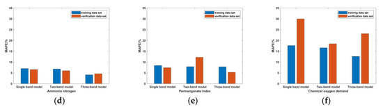 Six water quality indicators were retrieved from optimizing the combination of 26 bands of spectral data with the three-band model structure. Among all combinations considered as the corresponding independent variables, the model with the smallest MAPE of 14 sampling sites is selected. Six three-band models with optimized parameters are shown in Table 4. All exponential terms are positive and most of them are greater than 1. It is found that the optimal wavelengths are even more concentrated in three-band models than those in single-band and two-band models. More mutual bands appear among different optimal indicator inversions, such as 407 nm, 433 nm, and 676 nm.