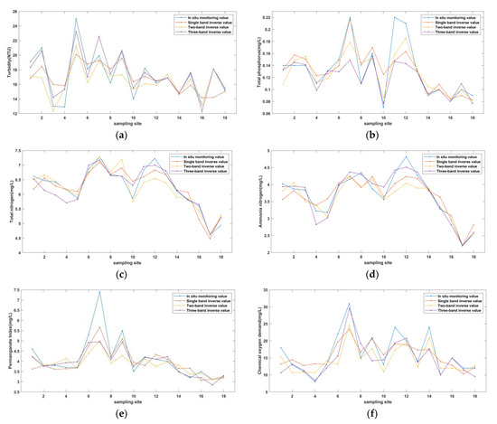 The in situ measured water quality data and the inversion data for the model with the best inversion of the three structures are shown in Figure 11. It can be seen that the inversion results for all six water quality indicators are quite good. There are some differences between the inversions for different water quality indicators, with the best inversions for total nitrogen. In addition, the structure of the model with the best inversion effect for different water quality indicators is also inconsistent.