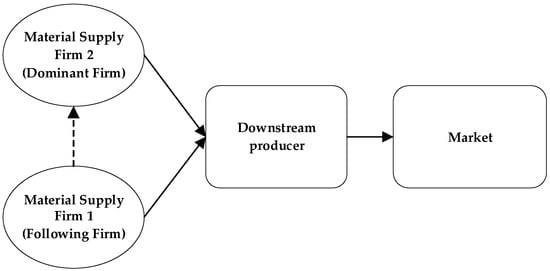 Supply chains are complex systems which consist of multiple member firms. In the study of supply-and-demand relationships, the existing literature focuses on the relationship between two suppliers and one retailer [17,18,19,20,21,22,23,24,25,26] and multilevel supply chain relationships [7,9,27,28,29]. Shen et al. [30] studied a supply chain consisting of used product contributors, used consignment platforms, and new product suppliers, and they analyzed the platforms under the consignment contracts pricing strategy and the product selection strategy under a consignment contract. Huang and Li [31] investigated how a closed-loop supply chain consisting of a recycler and two competing manufacturers can simultaneously optimize the membership strategy and alleviate problems regarding profit allocation. Sadjadi et al. [32] developed a game model for a two-level supply chain consisting of a manufacturer and two retailers to study the effects of pricing structure and cooperative advertising decisions on supply chain coordination performance. Dey et al. [33] used the Stackelberg model to determine the best decision for a closed-loop supply chain consisting of a manufacturer, two suppliers, and two competing retailers. Rajabi et al. [34] studied joint pricing and inventory in a competitive supply chain consisting of a dominant manufacturer and two follower retailers facing nonlinear, price-dependent demand operating under Gounod model decisions. Hubert et al. [35] analyzed the role of blockchain adoption decisions and differentiated the pricing strategies of genuine manufacturers in combating counterfeit and counterfeit products based on a single-tier manufacturer framework. Huang [36] studied the stochastic used-product return problem in a closed-loop supply chain consisting of one manufacturer and one retailer concerned with fairness. Peng et al. [37] employed the evolutionary game method to develop a tripartite evolutionary game model that reflects the interaction of interests among food raw material suppliers, food manufacturers, and consumers. In this paper, we modeled the game between multi-oligopolistic suppliers and downstream producers, focusing on the purchase of raw materials. In this regard, the goal of our paper was most similar to that of the study by Gong and Yang in [15]. However, Gong and Yang only considered the sequential pricing game model of two upstream producers, which assumes that the maximum demand and price sensitivity coefficients of downstream firms to two upstream producers are the same and do not fully reflect the characteristics of dominant firms; the model only considers the influence of two upstream firms’ own factors on prices, and other influencing factors such as downstream firms are set as ideal. This approach has some significance in the study of pricing mechanisms, but its results are not in line with the actual market scenario. In fact, upstream firms have certain bargaining power in the process of pricing, and the sales price of downstream firms affects the market demand for the product, which in turn affects the price and profit of upstream producers. Therefore, the purchase volume of downstream firms and the size of the dominant and following coefficients have an impact on the profitability and pricing of firms, and the pricing mechanism studied by Gong and Yang lacks certain degrees of scientificalness and rationality, as such actual influencing factors are not considered.