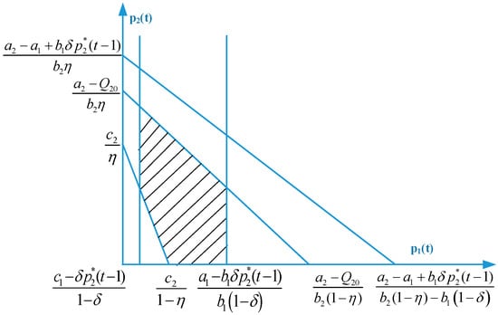 When the axis of symmetry of the first objective function of Equation (12) lies inside the feasible domain until equilibrium is reached and on the negative half-axis of the axis after equilibrium is reached, and the axis of symmetry of the second objective function in each period always lies inside the feasible domain, the equilibrium solution of the game corresponding to this model can only appear on the left boundary of the feasible domain at . At this point, the constraints in Equations (13) and (12) indicate that the model parameters should satisfy the following conditions: