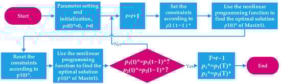 The specific process for solving the game equilibrium solution of this nonlinear bilevel programming model according to Equation (12) is given below and is shown in Figure 3. The equilibrium solution of the game for the sequential pricing game model with constraints can be seen in this flowchart. However, in some special cases, it is possible to directly find the equilibrium solution of the model without the tedious numerical calculation process shown in Figure 3. Assuming that denotes the axis of symmetry corresponding to the first objective function in Equation (12) in period t, denotes the axis of symmetry corresponding to the second objective function in Equation (12) at period t, denotes the axis of symmetry corresponding to the first objective function in Equation (12) at equilibrium, and denotes the axis of symmetry corresponding to the second objective function in Equation (12) at equilibrium; these special cases can be found according to the relationship between the axis of symmetry and the feasible domain.