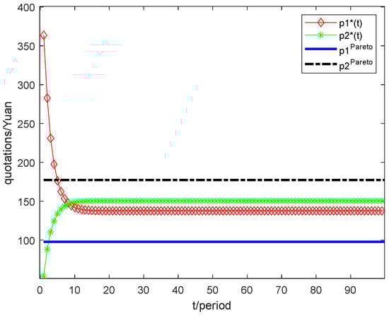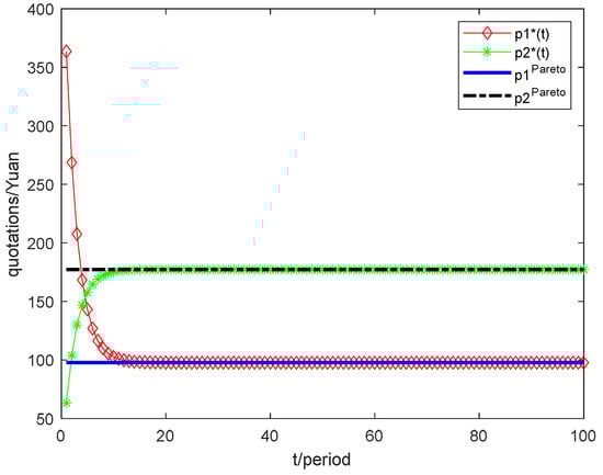 First, to visualize the process by which the model enters equilibrium, we provide the game process in the two cases where the equilibrium solution is Pareto-optimal and non-Pareto-optimal, respectively. The first example is a numerical simulation in which the equilibrium solution is a Pareto-optimal solution. Let , , , , , , , , and , where the model parameters satisfy the constraints shown in Equation (18), and the results of the comparison between the equilibrium solution according to Equation (12) and the Pareto-optimal solution according to Equation (15) are shown in Figure 4. If the absolute value of the difference between the two adjacent quotations of a firm does not exceed CNY 0.005 as the criterion for the model to enter equilibrium, the time taken by firm 1 to enter equilibrium is 24 periods and the equilibrium quotation is CNY 97.70, while the time taken by firm 2 to enter equilibrium is 22 periods and the equilibrium quotation is CNY 177.17. In contrast, the Pareto-optimal solutions for firm 1 and firm 2, which are derived directly from Equation (15), are CNY 97.69 and CNY 177.18, respectively. According to this result, the equilibrium solution according to Equation (12) and the Pareto-optimal solution directly according to Equation (15) are the same, which shows that the equilibrium solution of the pricing model with constraints is the Pareto-optimal solution at this point.