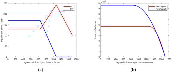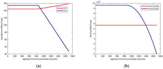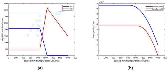 To better sustain their business, downstream firms generally sign long-term subscription agreements with dominant firms. In the previous section, the agreed minimum purchase volume was set as , and, according to the constraints, the agreed minimum purchase volume would have an impact on the quotation and profit of firms; the following simulation experiment was used to analyze how the agreed minimum purchase volume affects the equilibrium quotation and profit of firm 1 and firm 2.