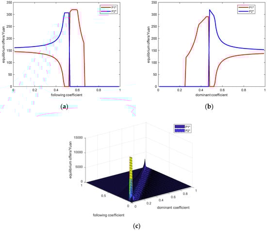 In this section, the influence of the following coefficient and the dominant coefficient on the equilibrium quoted prices of the two firms is analyzed. The following coefficient and the dominant coefficient are set as variable parameters, i.e., / and /, and the remaining parameters are kept constant. The following coefficient and the dominant coefficient are changed from 0 to 1, and the change in the equilibrium quoted prices of the two firms is analyzed. Figure 9a shows the effect of the following coefficient on the equilibrium solution when the dominant coefficient is used, and the difference between and increases. Figure 9b shows the effect of the dominant coefficient on the equilibrium solution when the following coefficient is used, and the difference between the equilibrium quoted prices of the two firms becomes increasingly smaller as the difference between and increases. Figure 9c shows the combined effect of the following and dominant coefficients and the dominant coefficient on the equilibrium solution. As the difference between and becomes larger, the difference between the equilibrium quoted prices of the two firms becomes smaller.