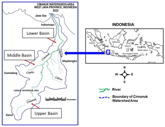 The Cimanuk watershed is an area along the Cimanuk river and geographically located at 06°13.7′–07°25.7′ South Latitude and 107°42.5′–108°24.5′ East Longitude (Figure 1). The watershed area is about 3493 km2, with the length of the main Cimanuk river is about 337.67 km [31]. The Cimanuk watershed is administratively shared by 4 regencies including Garut, Sumedang, Majalengka, and Indramayu.
