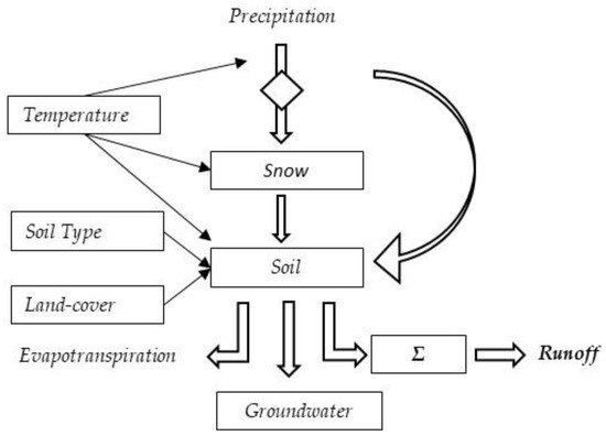 - Hurkmans, R.T.W.L.; de Moel, H.; Aerts, J.C.J.H.; Troch, P.A. Water Balance versus Land Surface Model in the Simulation of Rhine River Discharges. Water Resour. Res. 2008, 44, 1418. [Google Scholar] [CrossRef]