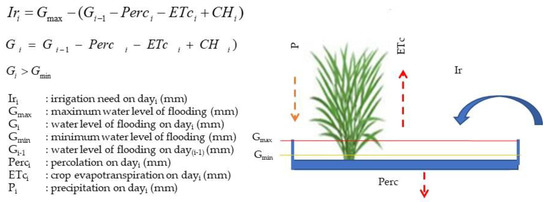 The next step of the analysis was water availability analysis in the study area using dependable flow analysis. The water availability in agricultural area can be represented by dependable flow of river cross to the area. Dependable flow is the amount of discharge available to meet water needs with a calculated risk of failure. Dependable flow represents 80% of exceedance provability of the minimum discharge [46]. This analysis utilized the simulated discharge output from the MOSAICC STREAM analysis as models input. The final step of analysis was the agricultural water balance analysis using modified CROPWat model by integrating inundation parameter [47]. This research specifically used the rice water balance model with inundation parameter integration to identify the balance between available water within the watershed and required water for agricultural purposes in the study area. The water balance formula used in this research is presented in Figure 3.