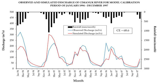 Observed and simulated discharge of Cimanuk River for model calibration, data period of January 1994–December 1997.