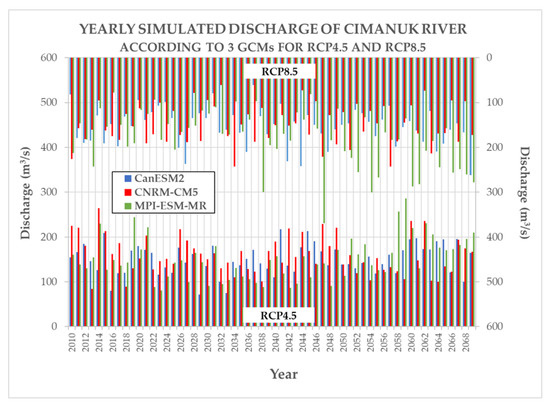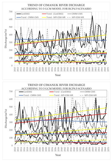 Figure 10 shows trends of the maximum, average, and minimum of the resulted simulated discharges of the Cimanuk Watershed, while the slope and Mann–Kendall coefficient of the trend is presented in Table 3. The Mann–Kendall trend analysis generally did not detect any trend for the simulated Cimanuk river discharges, except for the increasing trend of future discharges from RCP4.5 scenario of the MPI-ESM-MR model and decreasing trend from RCP8.5 scenario of the CNRM-CM5 and MPI-ESM-MR model. This result is in accordance with published similar research in Cimanuk watershed. Discharge simulation using the STREAM model yielded an insignificant trend of increasing discharge during the period of 1961 to 1980 and a decreasing trend in the next period from 1981 to 2006 [24].