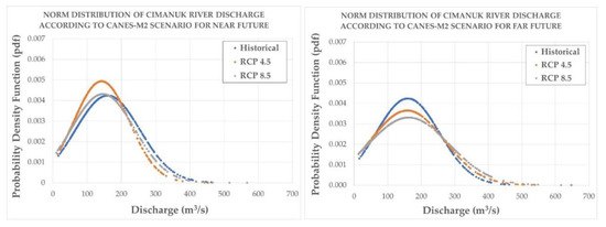 Norm distribution of Cimanuk River Discharge according to CanESM2 scenario for near and far future.