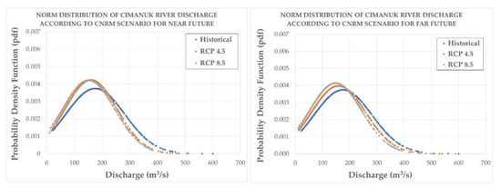 Norm distribution of Cimanuk River Discharge according to CNRM-CM5 scenario for near and far future.