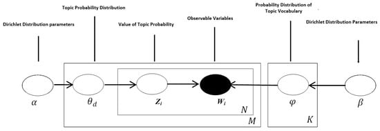 Latent Dirichlet allocation is a probabilistic Bayesian model for text content [26] that assumes each document has K topics. Each topic defines a multinomial distribution over the vocabulary, and it is assumed to have been drawn from . When the topics are given, the following generative process of each document is conducted by LDA. Firstly, distribution of over topics will be drawn. Secondly, for each word i in d, draw a topic index from the topic weights , and observed word from selected topic, . In addition, and are Dirichlet distribution parameters. The overview of LDA is shown in Figure 2.