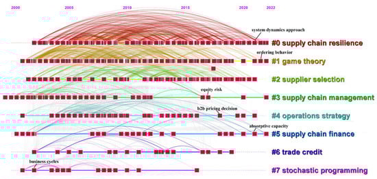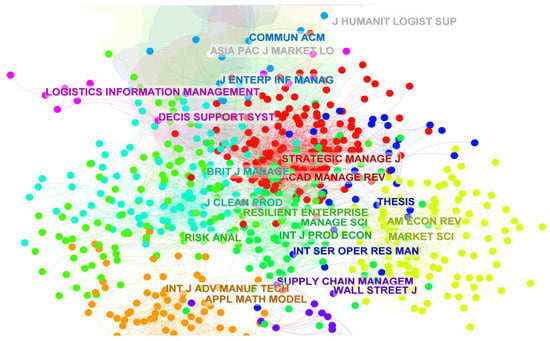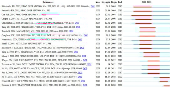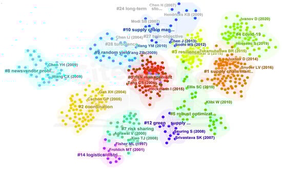 From Table 8, the top-ranked item by citation counts is the paper written by William Ho (2015) with a citation count of 100. It was published in the International Journal of Production Research. The second one is Christopher S. Tang (2006) with citation counts of 81. The third is Iris Heckmann, et al. (2015) with citation counts of 75. Next, all references will be clustered with CiteSpace, the results of which are shown in Figure 10. Because co-cited references could include most literature in the field of SCRM, the results of clustering are more decentralized. Secondly, we obtain different categories, the top 10 of which are shown in Figure 11 and Table 9.
