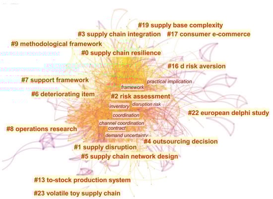 SCRM is one of the most significant operations management research fields. This study will highlight transformations in the intensity of publications in terms of changes in their terms and keywords, as well as citations, etc. Co-occurring phrases or co-occurring keywords reveal the most active areas in a discipline’s publications. Terms are extracted from all titles and abstracts and keywords. The co-occurring terms network is built and analyzed by CiteSpace. Then these terms are processed by spectral clustering, as shown in Figure 3.