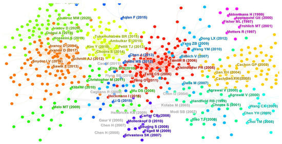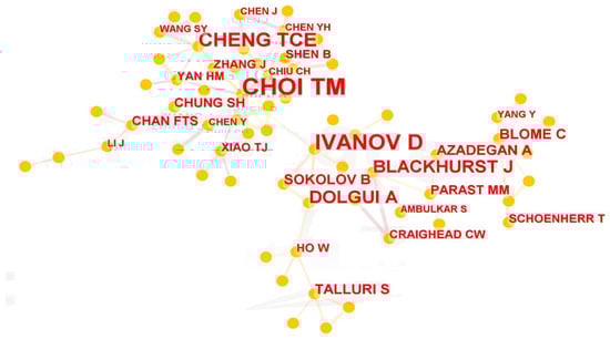 CiteSpace can help us understand which authors, institutions, or countries are pivotal in the field of supply chain risk. The network of authors’ cooperation, institutions’ cooperation, and countries’ cooperation will be constructed, as follows.