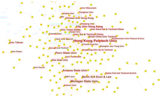 The institutions’ cooperation network is shown in Table 6 and Figure 8. Ordering by the numbers of published papers or PageRank, Hong Kong Polytech University, Michigan State University, and Penn State University occupy the top three slots.