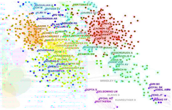 This analysis of the co-cited author is the same as the authors’ cooperation analysis. The relations of authors are connected (as shown in Figure 13).