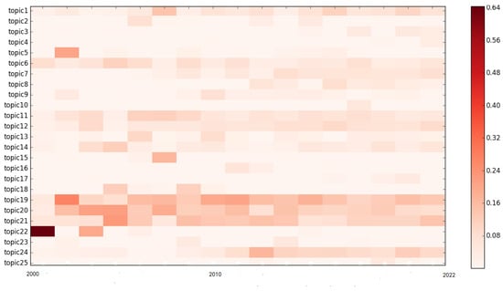 In the next step, we will observe the evolution of 25 topics from 2000 to 2022, as shown in the heatmap in Figure 17 and Table 13.