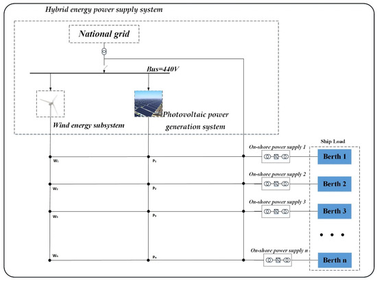 The wind energy system, photovoltaic power generation system and national grid system constitute a hybrid energy power supply system. The power supply system is connected to the ship load. In the hybrid energy power supply system, the output of wind power and photovoltaic power generation system is preferentially used to meet the power demand of the ship. In the case of insufficient wind power and photovoltaic power generation, the power of the grid is used to meet the remaining power supply demand of the ship.