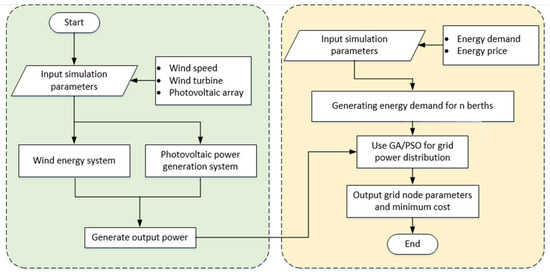 In the grid power distribution system, the ship load at the port is dynamically changed in a period of time. In this study, genetic algorithm (GA) [20] and particle swarm optimization algorithm (PSO) are used to calculate the parameters of each grid node when the cost of port hybrid energy power supply system is the lowest, so as to achieve the economic optimal solution. The grid power allocation steps of the two optimization algorithms are shown in Figure 3.