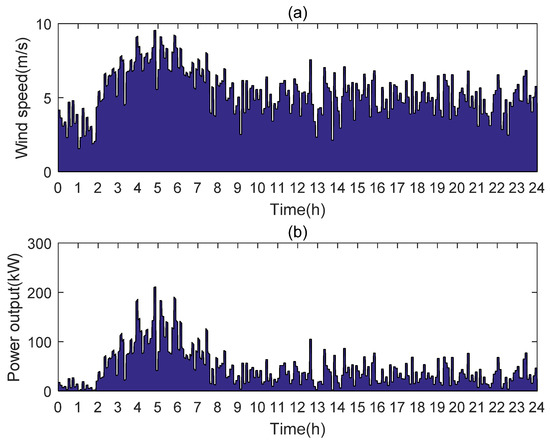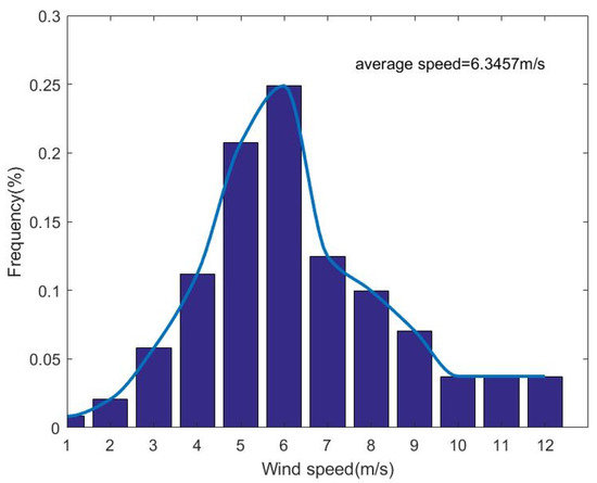 According to the above parameters, the wind speed data of 24 h a day can be obtained. The hourly distribution characteristics of wind speed can be obtained by processing the wind speed data, as shown in Figure 4. Visible wind speed is concentrated in 4–7 m/s, the average wind speed is 6.3457 m/s.